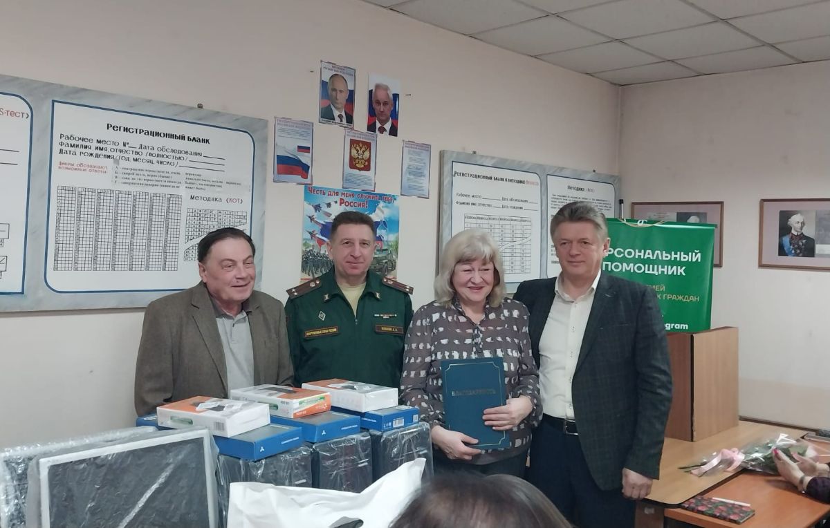 От имени Коломенского отделения работникам военкомата были вручены Поздравительный адрес, 3 компьютера, которые так необходимы для их повседневной деятельности, силовые блоки. Ну, а в честь праздника были подарены сладости к чаю.